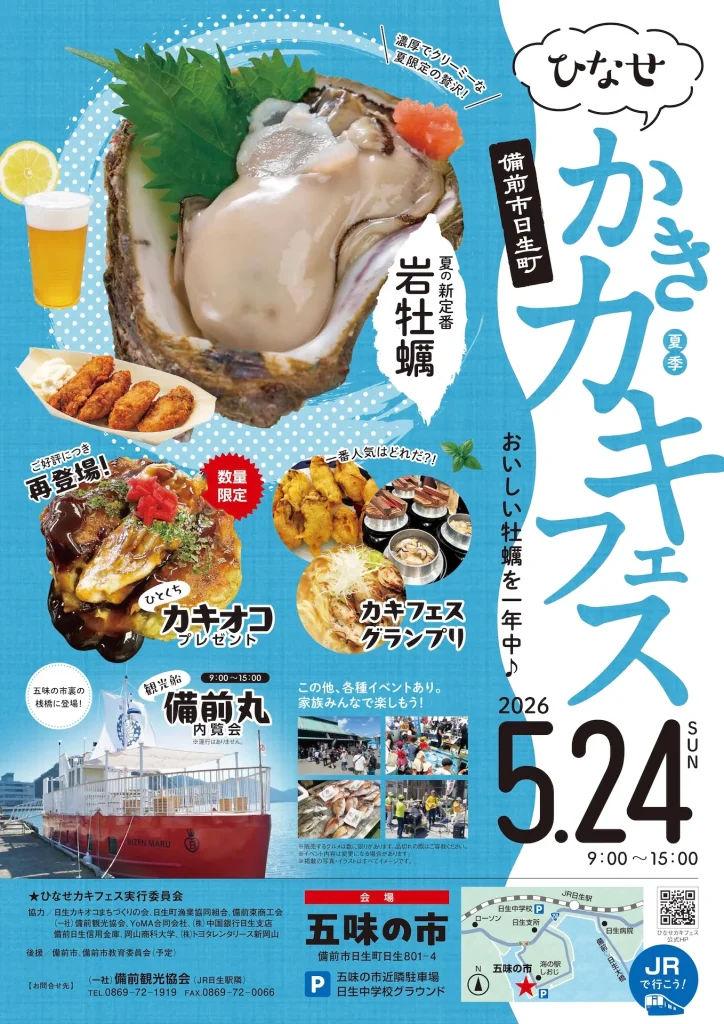 Delicious oysters all year round! The "Hinase Oyster Festival," which has been held under the theme of "Oysters all year round," will be held again this year! Only during the summer season! The festival will feature a wide variety of oyster delicacies, including raw oysters, oyster cakes, and more! Date [Date] May... 2026. -