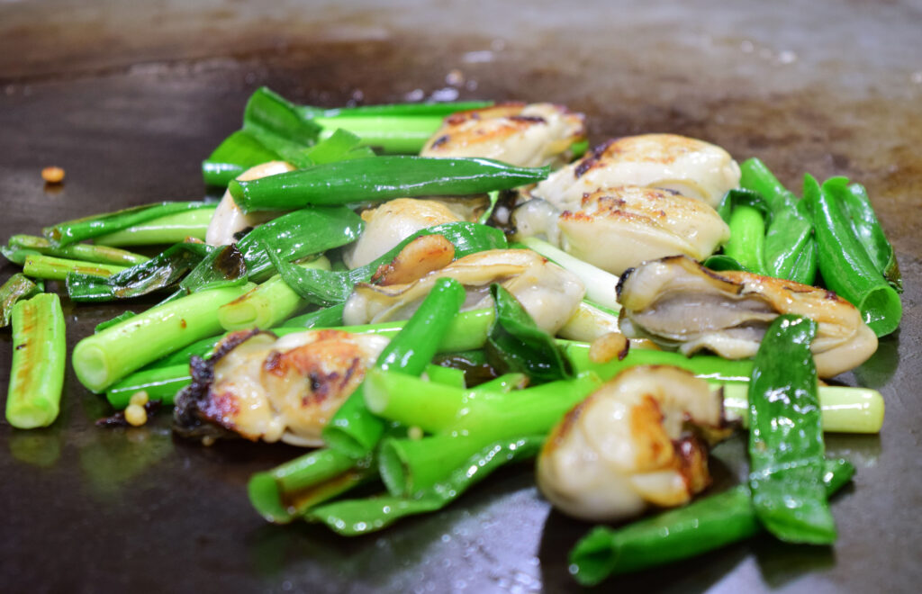 瀬戸内の美味しい海の素材を、極厚の鉄板で焼く、カキオコ・カキネギ・アナゴの角焼きが特におススメ。半分はソース、半分は岩塩で食べるお好み焼きは、オリーブオイル使用で外はカリッと、中はフンワリの食感が最高です。オタメシアレ。