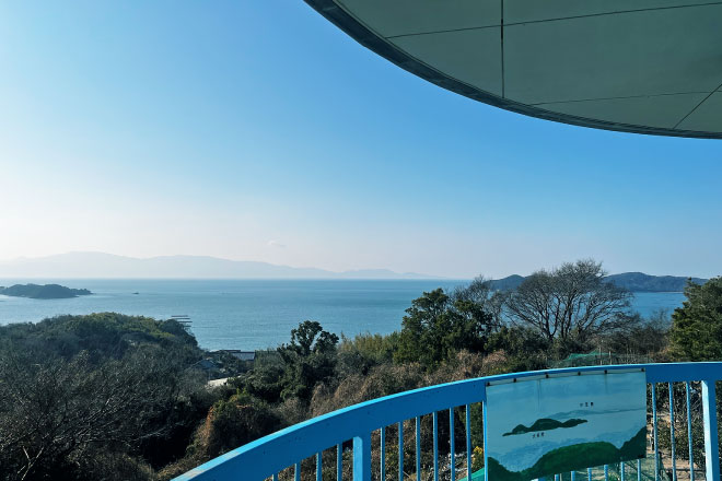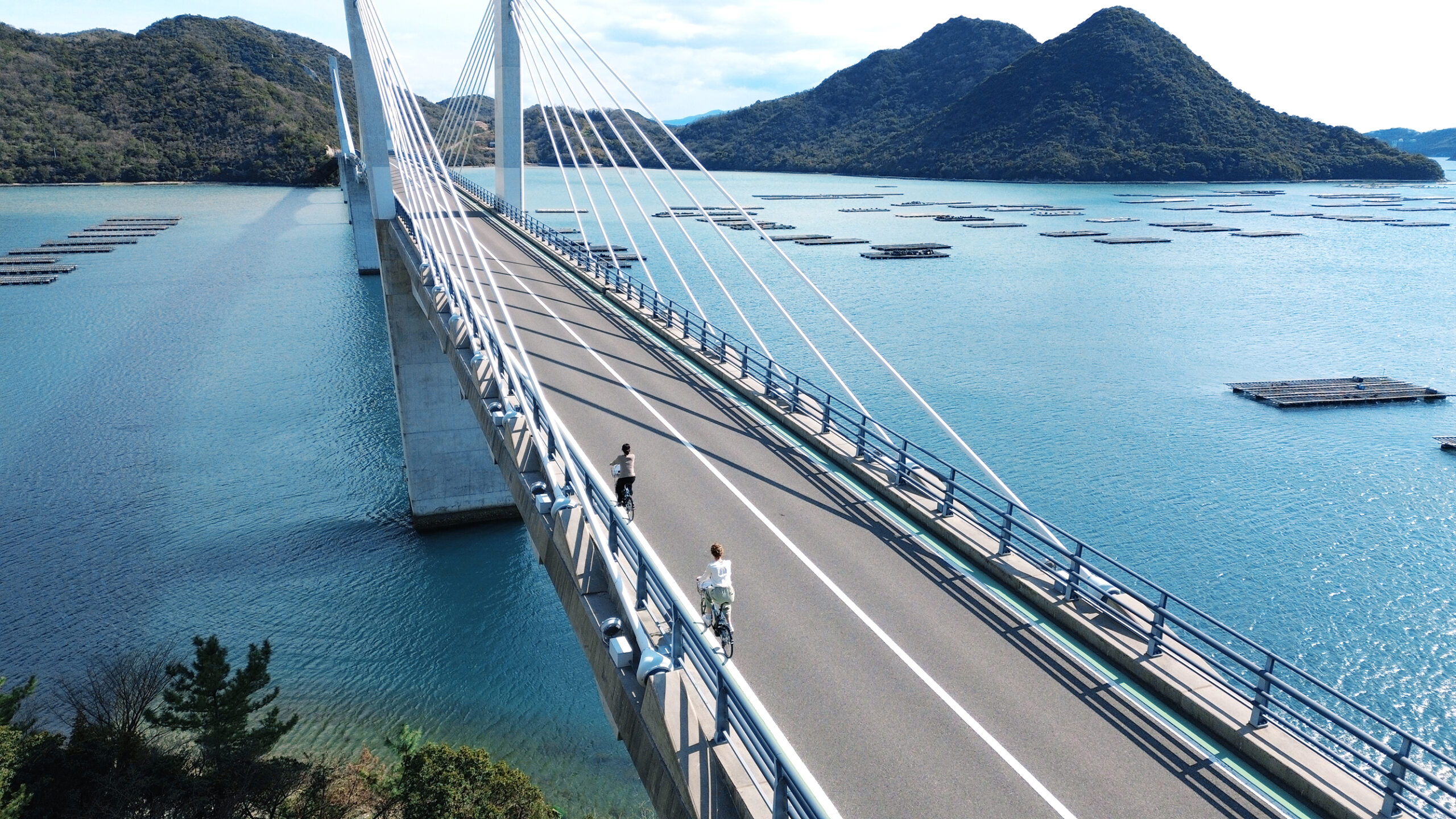 2015年に開通した、備前市日生町と鹿久居島を結ぶ全長765mの橋。正式名称に「♡」が入る橋として開通時話題になりました。もちろん自転車の通行が可能で、眼下に広がるカキいかだなど日生ならではの光景を楽しめます。