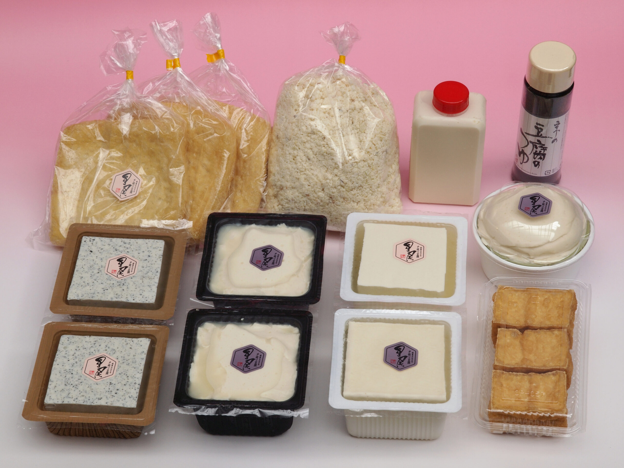 全国の農家の方々が栽培した安心、安全の国産大豆を100%使い、水は豆腐と相性の良い高純度軟水を使用しています。三重釜蒸らし炊き製法にて大豆の旨味を存分に引き出したこだわりの手造り豆腐が人気商品です。